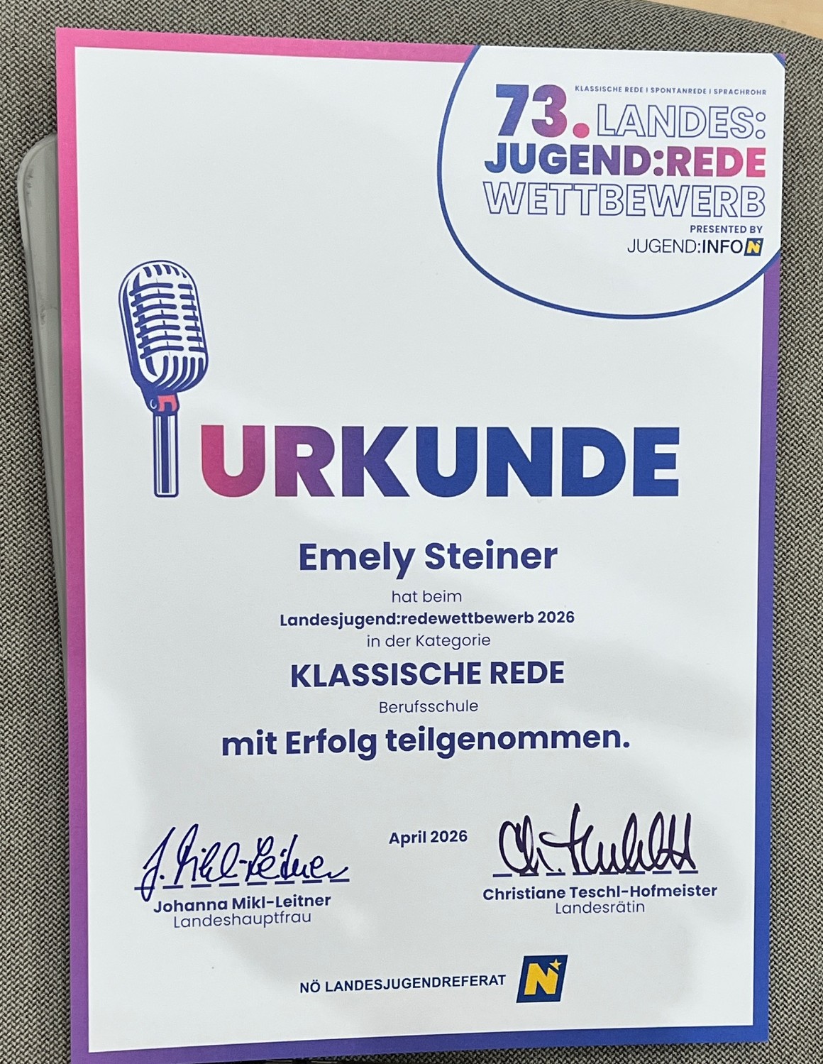 Der große Applaus der Zuhörer bestätigte den grossartigen Inhalt und die tolle Darbietung. Emely Steiner durfte sich nicht nur über die Urkunde freuen, sondern darüber hinaus reichlich Erfahrung sammeln.